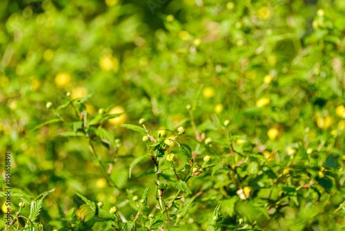 春の庭に咲く鮮やかな黄色のヤマブキ(山吹)の蕾と緑の葉のクローズアップ。自然背景や春のイメージ素材。