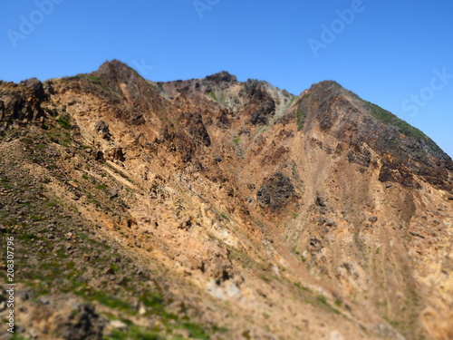 mountain, landscape, sky, nature, rock, blue, hill, desert, travel, panorama, green, summer, cloud, scenic, view, panoramic, round, depression, pitted, rocky, outdoors, day, diorama, sunny, climb, trek, hike, mountain, mountain chain