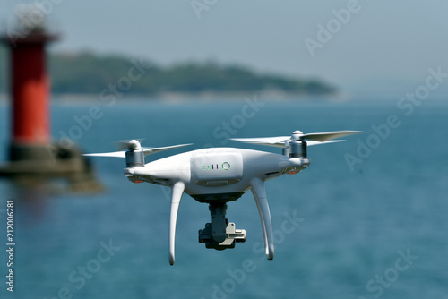 drone, lighthouse, wireless, radio, blue skies, fly, camera, shot, open air, sunny, landscape, white, plane, take off, mid-air, levee, model, fuselage, technology, flight, transmitter, control, video, camcorder, standby, flying, airscrew, unmanned