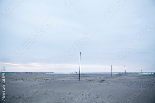 telephone pole, beach, morning, sky, wind, landscape, water, sea, nature, energy, electricity, blue, coast, white, sand