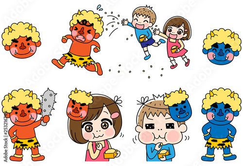 illustration, vector, setsubun, cut, event, february, devil, evacuate, custom, kindergarten, preschool, elementary school, training, children, toddler, boy, girl, smile, game, meal