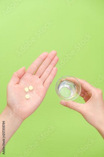 写真素材:錠剤を持つ手 水 コップ 医薬品 治療 慢性疲労