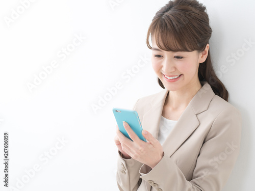 woman, girl, smartphone, smartphone, mobile phone, call, mobile, mail, cyberspace, business, white, white background, young, people, adult, homemaker, suit, smile, sweet, pretty, pretty, clean, joyful, rejoice, japanese, asian, indoor, indoor, room, career woman, ol, ict, ar, app, satisfaction, search, examine