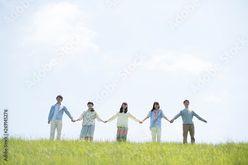 student, meadow, friends, fellow, connect, smile, smile, sky, blue skies, relax, cuddle, leisure, outdoors, travel, journey, communication, fun, lively, frolic, young, youth, chum, people, japanese, man, woman, open air, nature, front, lifestyle