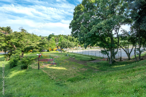 park, tokyo, tokyo, playground, landscape, blue skies, city, sunny, swing, sandbox, fountain, refuge, evacuation, disaster, open air, utility, signs, background, drill, oasis, green, green