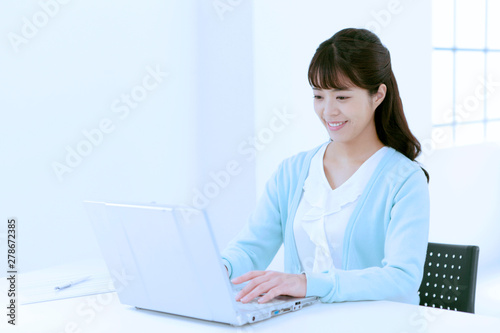 distance learning, meeting, videophone, study, student, business, japanese, people, adult, woman, 30s, look, smile, notebook, personal computer, information, office, indoor, home, house, young, telecommuting, meeting, examine, search, cyberspace