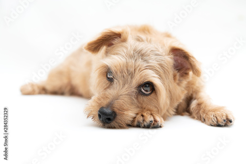dog, terrier, dog, puppy, sweet, pet, animal, mammal, small, brown, white background, go to bed, look, interest, contemplate, look up, top