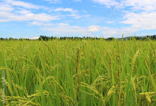 rice, green, nature, agriculture, plant, grass, crop, farm, food, ear, harvest, grow, growth, seed, rural, paddy, idyl, countryside, rice field, crop, landscape, view, farming, sky, cloud, blue skies