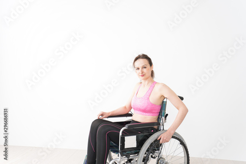スポーツウェアを着て車椅子に乗る外国人の女性