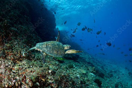 ボニンブルーの海を泳ぐアオウミガメ