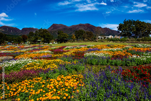 field, flower, landscape, spring, nature, sky, summer, meadow, green, yellow, mountain, grass, blue, agriculture, flowering, red, beauty, farm, bloom, pigmentation, colourful, lovely, rural, cloud, flowerbed, flower garden, marigold, sage