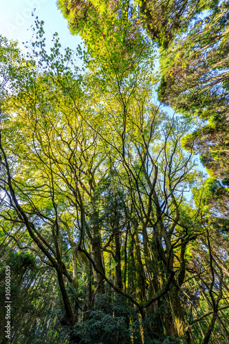 forest, wood, nature, fall, green, sky, leaf, landscape, foliage, spring, fall, park, summer, season, branch, pine, sun, trunk, blue, outdoors, plant, natural monument, kyushu