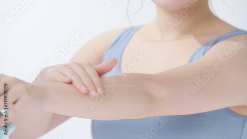 woman, skincare, cosmetic, beauty, skin, face, toilet water, girl, latex, gel, people, japanese, asian, white, white background, arm, epilation, massage, este, paint, smile, joyful, rejoice, fun, cream, expression, young, summer, morning, ultraviolet, sunblock, diet, homemaker, upper arm, dryness, decollete
