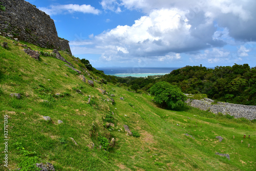 landscape, mountain, sky, nature, green, hill, summer, grass, blue, rock, depression, wood, cloud, meadow, forest, travel, rural, panorama, path, field, spring, pitted, view, scenic, lovely, aged, castle, tour tourism, history, historic site, okinawa, world heritage
