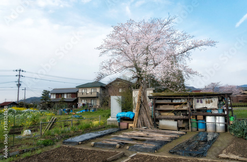 cherry blossom, full bloom, flower, field, blue skies, sunny, spring, landscape, cloud, lovely, bloom, plant, bloom, farm equipment, leaf, view, house, dirt, earth, farmland, wood, wood, countryside