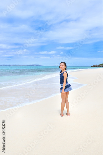 sea, girl, children, woman, beach, fun, play, girl, woman, lively, joyful, refreshing, rejoice, smile, pretty, open air, sunny, smile, japanese, people, copy space, wave, beach, portrait, young, water, brine, nature, stand, okinawa, sky, blue skies, vacation, summer, summer getaway, bathing, swimwear, landscape
