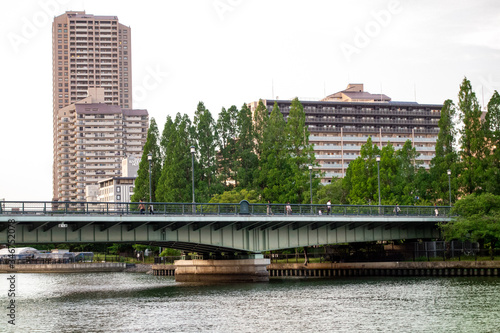 evening, stream, osaka, dusk, bridge, promenade, promenade, sky, blue skies, asia, japan, town, way, crossover, building, construction, highrise, city, office, orange, view, landscape, background, material, copy space, illustration, background