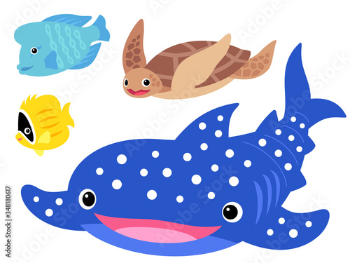 rhincodon typus, illustration, sea, sea turtle, tortoise, swim, fish, marin, icon, character, design, flat, comic, light, smile, pop, pretty, sweet, lively, fellow, creature, sea, okinawa, set, dive, aquarium, animal, manga, isolated, white background, vector, children, kitsch, fun