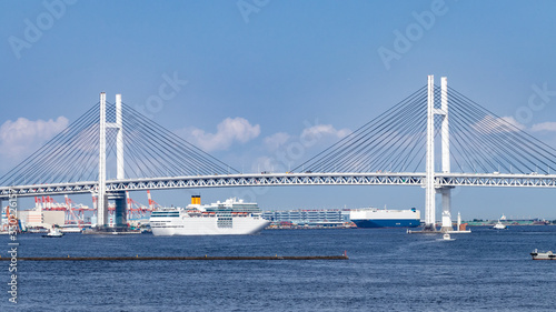 blue skies, background, bay bridge, bottom, passage, yokohama, bridge, port, water, architecture, city, sky, sea, blue, travel, landmark, route, horizon, urban