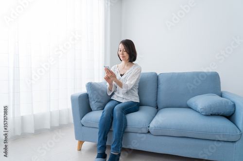 smartphone, aged, woman, mobile, mobile phone, smartphone, middle-aged, people, japanese, search, examine, input, operation, seek, house, home, house, residence, dining, indoor, indoor, waist up, face, copy space, chair, seated, table, casual, 50's, 60's, mail, app, lifestyle, portrait, room, second life, smile, smile, look