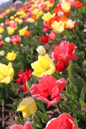 tulip, flower, spring, field, plant, nature, flower petals, landscape, full bloom, open air, blue skies, yellow, green, leaf, flower garden, flowerbed, red, sunny, park, gardening, gardening, garden, background, white, sweet, clean, light, pretty, lovely, spring, red, plant, green, flowering, field, beauty, bloom, pink, floral