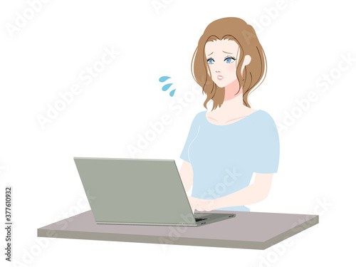 woman, personal computer, notebook, working, work, people, young, sweet, table, business, cyberspace, waist up, beauty, white, model, illustration, vector, operation, alien, japanese, beauty, clean, problem, unable, apprehension, unhappy, sweat