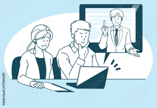 オンラインで商談する若い夫婦とビジネスマンのイラスト
