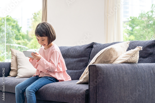 smartphone, smartphone, children, children, children, children, child rearing, people, japanese, asian, girl, woman, indoor, indoor, home, house, lifestyle, cyberspace, online, videophone, delivery, couch, couch, smile, motion picture, look, net, game, app, relax, training, tablet, mobile phone, digital, study, learning, play, game, animation