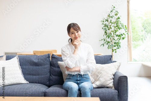 contemplate, trouble, thought, imagination, woman, people, japanese, asian, girl, young, 30s, homemaker, indoor, indoor, home, house, room, couch, couch, seated, smile, casual, natural, clean, smile, light, refreshing, relax, relax, lifestyle, live, house, residence, new life, home, life