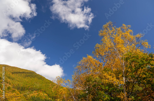 blue skies, sky, fall, wood, mountain, cloud, sunny, nature, landscape, look up, plateau, copy space, leaf, forest, plant, landscape, japan, photo