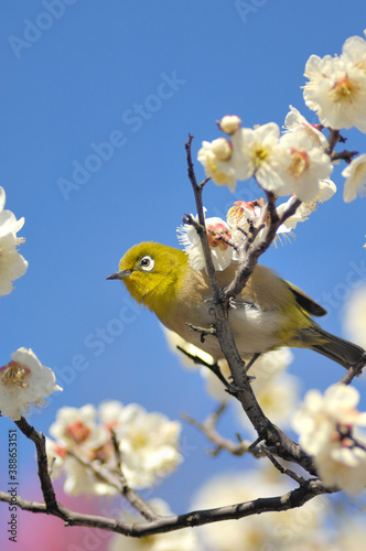 spring, flower, bud, blue skies, branch, bird, bird, chartreuse, white, sky, flower, flower, plant, bird, white, white, spring, season, four seasons, sunny, avian, pigmentation, colours