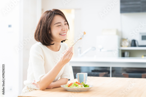 woman, meal, meal, smile, breakfast, snack, lunch, diet, salad, conversation, hearthstone, happy, happiness, kitchen, kitchen, living room, home, life, lifestyle, light, young, fork, dish, cup, people, girl, delicious, pretty, lovely, table, table, japanese, health, alimentation, relax, sweet, fun, smile, smile, asian