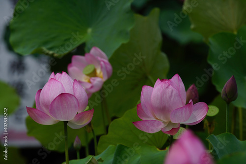 寺院の庭に咲くピンクの蓮の花