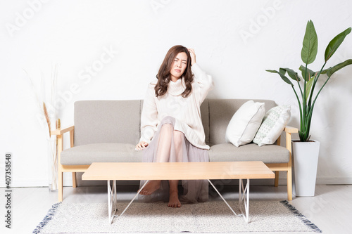 リビングのソファに座っている、トラブルに悩む女性
