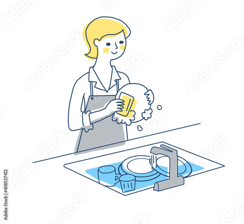 illustration, people, woman, homemaker, waist up, cleanse, dish, cleanup, apron, mother, young, 30s, laundry, kitchen, kitchen, housekeeping, foam, sponge, sink, short hair, japanese, smile, indoor, lifestyle, mother, mother, middle-aged, home, clean, tap, cleanser, pretty, cleaning