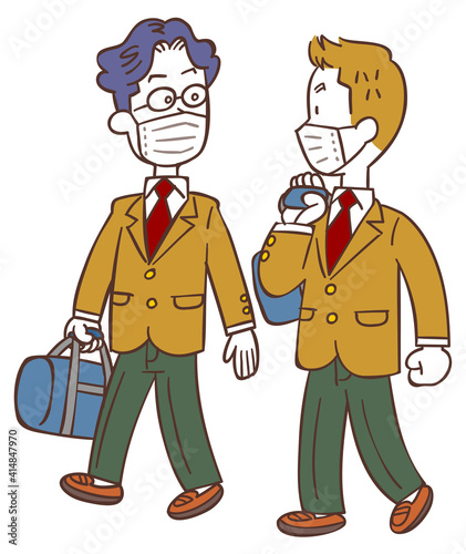 mask, student, uniform, boy, student, walk, conversation, people, school, study, challenger, young, preparatory school, prevention, virus, hay fever, illustration, vector