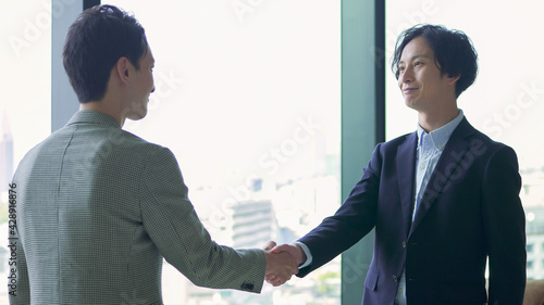 smile, handshake, business, businessman, salaried employee, man, office, people, 30s, young, japanese, asian, two people, employee, work, work, hand, hold, gratitude, greeting, success, contract, achievement, cheer, meeting, meeting, meeting, speaking, conversation, team, presentation, presentation, colleague, boss, secondary, client, project, manpower, salesman, indoor, businessman