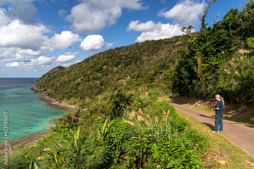 奄美大島の大和村 宮古崎で動画撮影する女性フォトグラファー