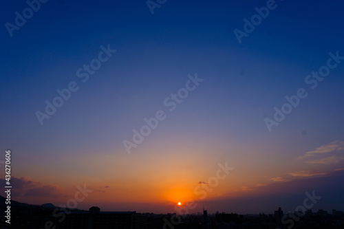 神戸市東灘区のマンションの高層階からの夜明け。太陽が顔を出し、空がオレンジ色からブルーのグラデーションに染まる