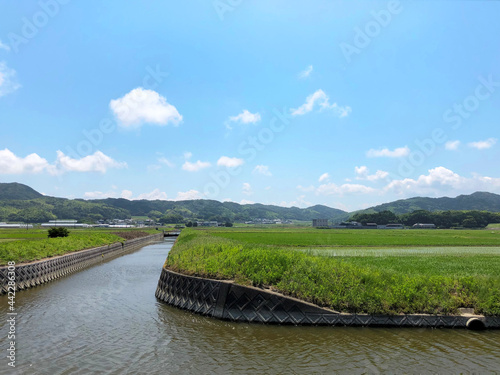 canal, blue skies, rice field, field, rice field, sky, cloud, white, green, stream, mountain, countryside, open air, rice, farming, farmhouse, light, landscape, sunny, copy space, japan, summer, paddy, water, germ bud, wood, gradation, food, planting, great, june, background, water surface, watercourse