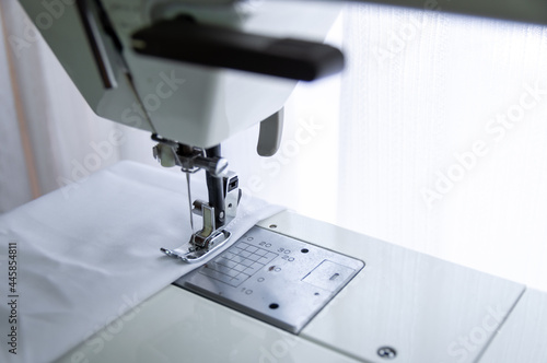ミシンで白い布を縫う