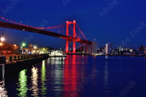 beach, bridge, street light, nightscape, red, sea, quay, port, building, sky, night, illumination