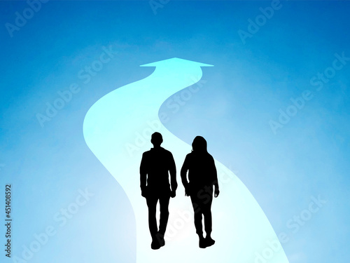 青空に曲がり道の矢印と男女のシルエット