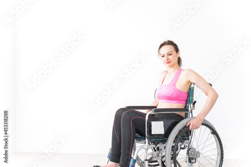 スポーツウェアを着て車椅子に乗る外国人の女性