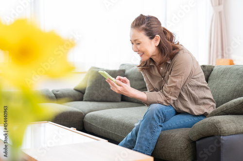 woman, aged, smile, smartphone, smartphone, cyberspace, search, mail, hand, possess, success, work, happy, people, japanese, business, middle-aged, casual, couch, life, home, lifestyle, indoor, property, asian, image, fun, smile, light, smile, happy, happiness, 50's, 60's