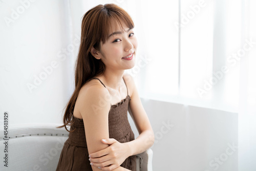 woman, japanese, home, happy, living room, window, lovely, couch, dress, beauty, drape, young, white, couch, lifestyle, relax, room, familiar, smiling, relaxation, portrait, smile, person, morning, merry, relaxation, eastern, waist up, living room, people, 1, indoor, smile, indoor, seated, casual