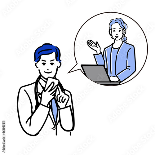 スマホを持つアジア人の医者男性と吹き出しの中のオペレターの上半身のシンプルな白バックの線画
