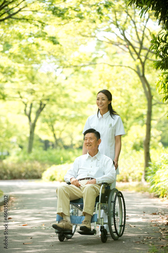 japanese, may, 70, staff, young adult, medical care, push, open air, science, care, nurse, youth, woman, waist up, people, man, adult, man, two people, japan, labcoat, walk, aged, aged, medicine