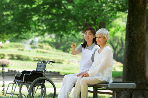 japanese, 50's, may, bench, lifestyle, relax, kind, open air, calm, care, nurse, seated, point, spring, woman, smile, people, man, adult, two people, aged, aged, middle-aged