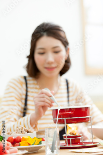 japanese, spoon, cheese fondue, table, party, young adult, lifestyle, food and drink, indoor, vacation, look, seated, possess, youth, woman, waist up, food, foodstuff, meal, table, people, man, adult, japan, room, dish